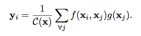 以图像为背景来说的话,i,j 是像素坐标,x,y 是输入和输出信息。j 的取值范围是任意的坐标。C(x) 是一个归一化常数。f(.) 是用来构建 i,j 点处信息关联的二输入函数。g(.) 是计算j 点信息对 i 点影响的单输入函数。
