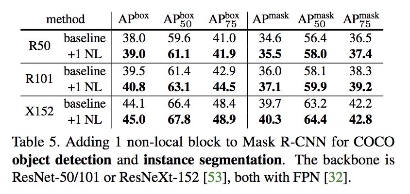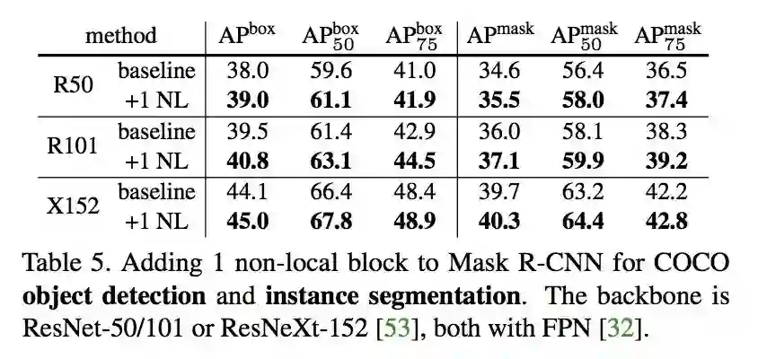 在 COCO 数据库上的实验结果如下所示。鉴于 NL block 结构的易用性,在平时设计网络时可以考虑添加这样的模块。