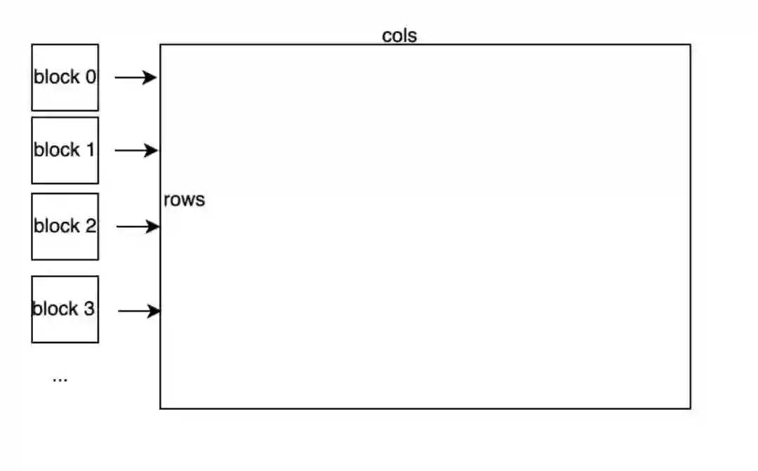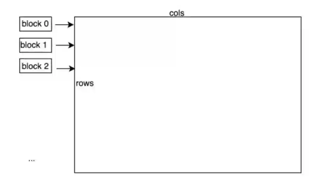 硬件上并行执行的32个线程称之为一个 Warp,同一个 Warp 的32个 thread 执行同一条指令, Warp是 GPU 调度执行的基本单元。线程块和元素的对应关系如上图所示,每个 Warp 的 threads 处理一行元素,每个 block 有 block\_size / warp\_size个 Warp,每个 block 处理 block\_size / warp\_size 行元素。