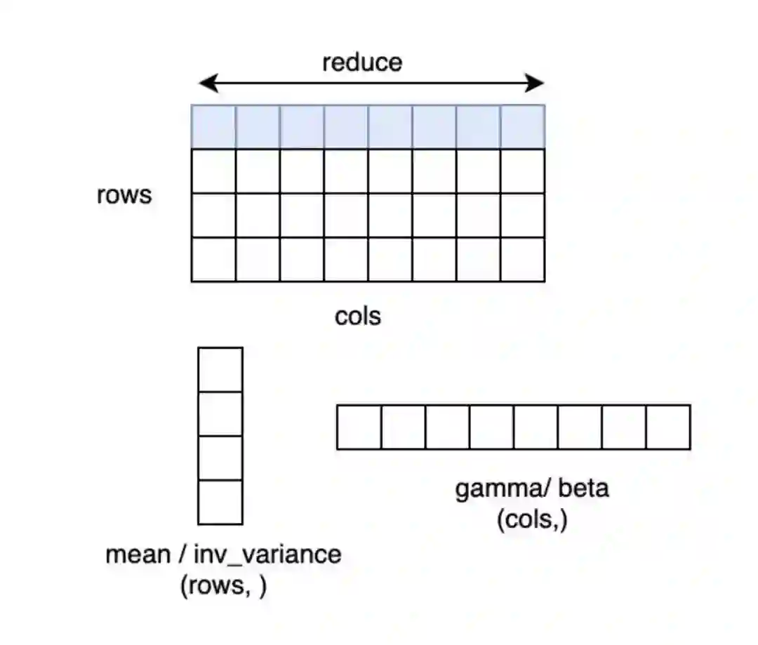 LayerNorm 是语言模型中常用的操作之一,其 CUDA Kernel 实现的高效性会影响很多网络最终的训练速度,Softmax 的优化方法也适用于 LayerNorm,LayerNorm 的数据也可以表示为 (num_rows, num_cols),计算过程中对每一行的元素做 Reduce 操作求均值方差。因此我们使用了和 Softmax 同样的优化方法来优化 LayerNorm 操作,本文以 LayerNorm 前向计算为例进行介绍。
