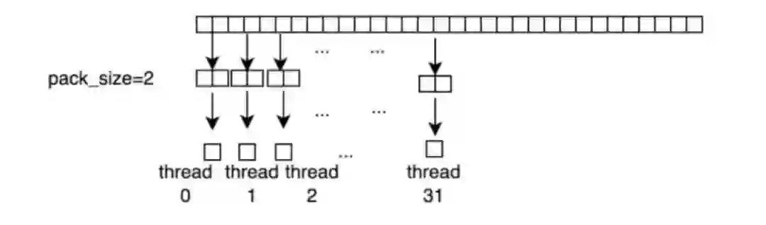 此外,在读写输入输出时,我们采用向量化访存的优化,在满足条件时,将 pack_size 个元素 pack 成更大的数据类型读入,下图为 pack_size=2 时的示意图,每个线程以更大的数据类型读入元素,可以更好的利用显存带宽。