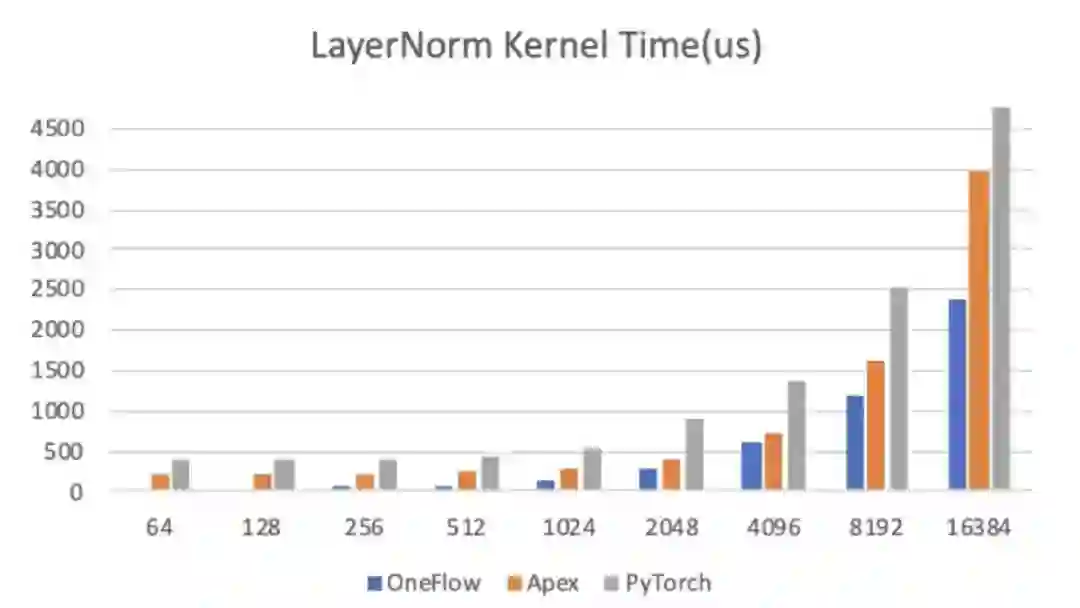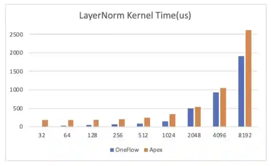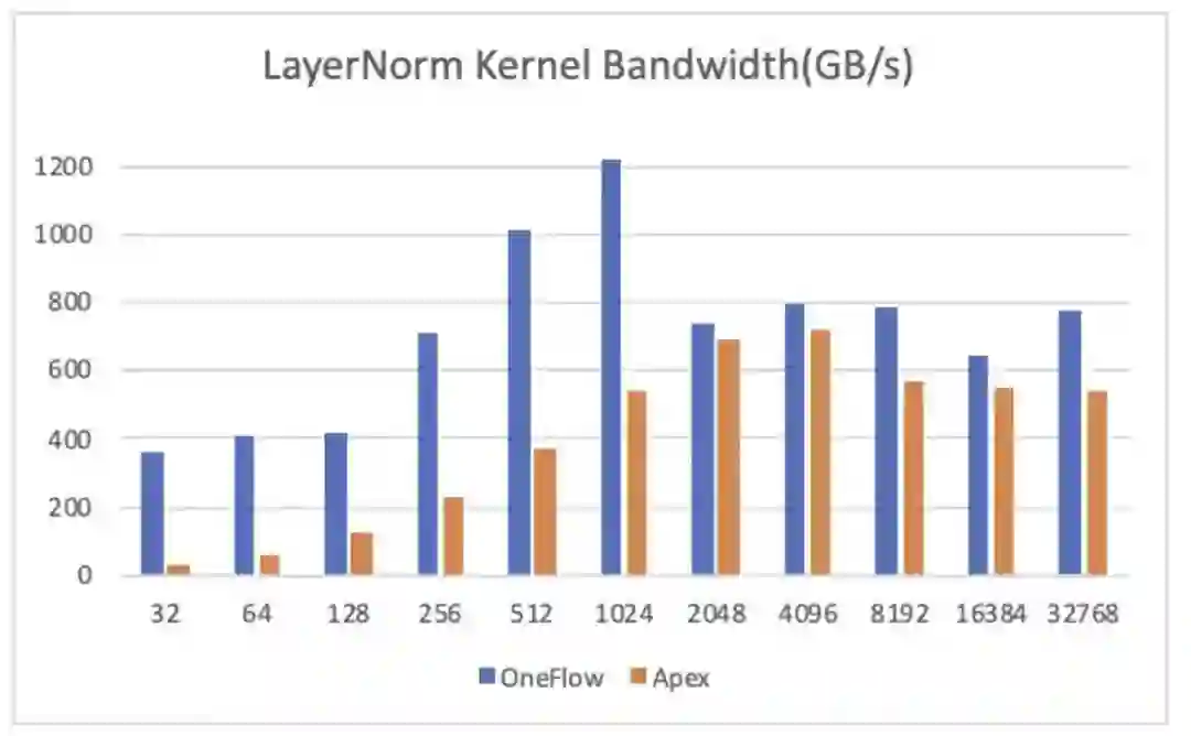 OneFlow 优化后的 LayerNorm 分别与 NVIDIA Apex、PyTorch 做了性能对比,测试结果显示,OneFlow LayerNorm 有明显的性能优势。