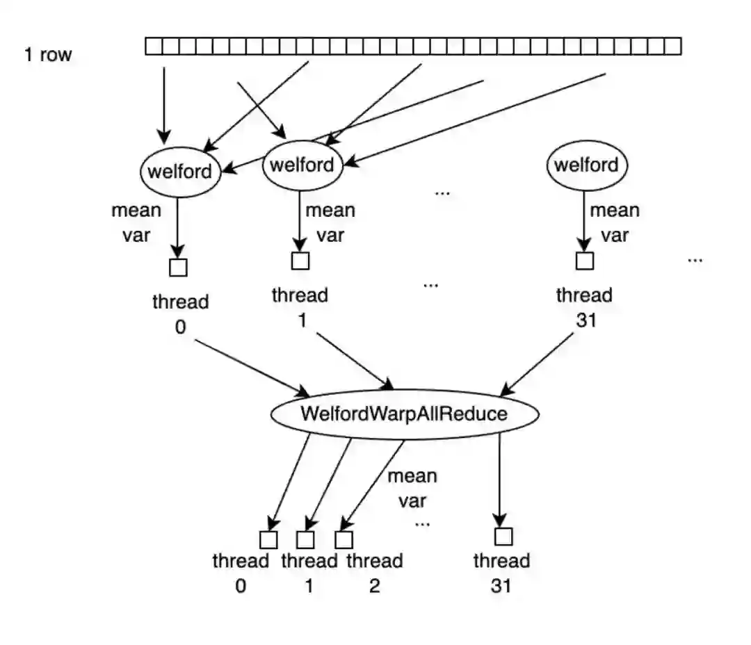 具体的处理流程是,如下图所示,每行有 num\_cols 个元素,每个 warp 处理一行,因此每个线程需要处理 num\_cols / warp\_size 个元素,每个线程读取自己需要处理的元素存储到寄存器中,并用 Welford 算法计算好均值和方差后,Warp 中的所有线程执行一次 WelfordWarpAllReduce,这样每个线程上就得到了正确的均值和方差参与后续计算。