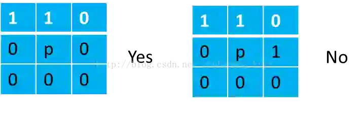 比如判断点p的8邻域是否只含有2连通的区域,可以这样实现: