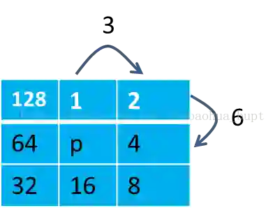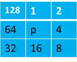 由于操作的是二值图像,在判断p的8邻域的最大连通域是否只含有2连通域时,只需要对p的8邻域进行加权相加得到一个值,记作p2,然后去c2里查询,如果c2里有p2,则点p周围的8邻域只含有2连通的区域。比如: