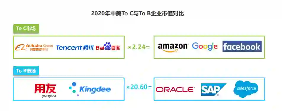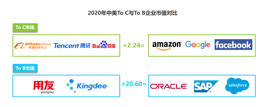 而对于整个B端行业来说,其实发展空间更大。数据表明,在互联网C端行业美国和中国的体量相差无几,但是在B端行业中国的体量只有美国体量的1/20。