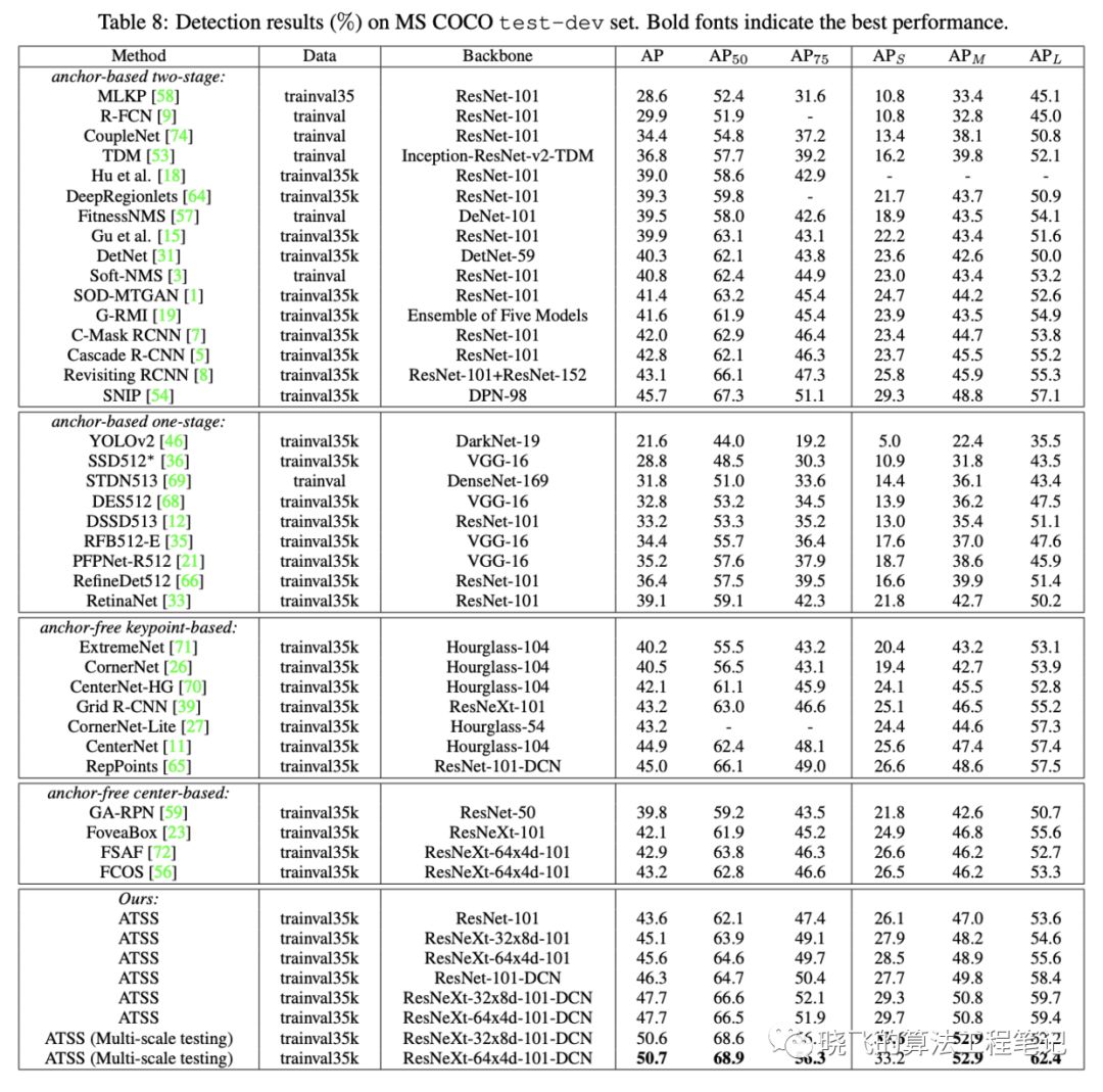 论文指出one-stage anchor-based和center-based anchor-free检测算法间的差异主要来自于正负样本的选择,基于此提出ATSS(Adaptive Training Sample Selection)方法,该方法能够自动根据GT的相关统计特征选择合适的anchor box作为正样本,在不带来额外计算量和参数的情况下,能够大幅提升模型的性能,十分有用。