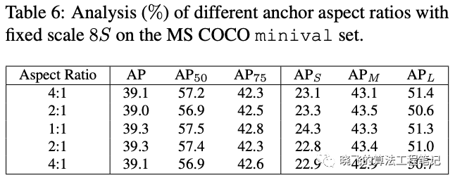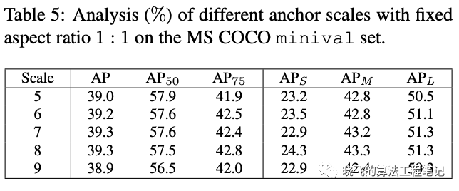 的anchor box,论文对不同的尺寸进行了对比,如表5所示,也在