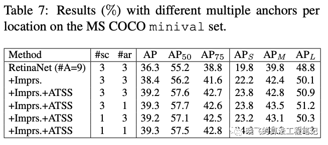 前面的RetinaNet实验只用了一个anchor box,论文补充测试了不同anchor数下的性能,实验中的Imprs为表1中的提升手段。从结果来看,在每个位置设定多个anchor box是无用的操作,关键在于选择合适的正样本