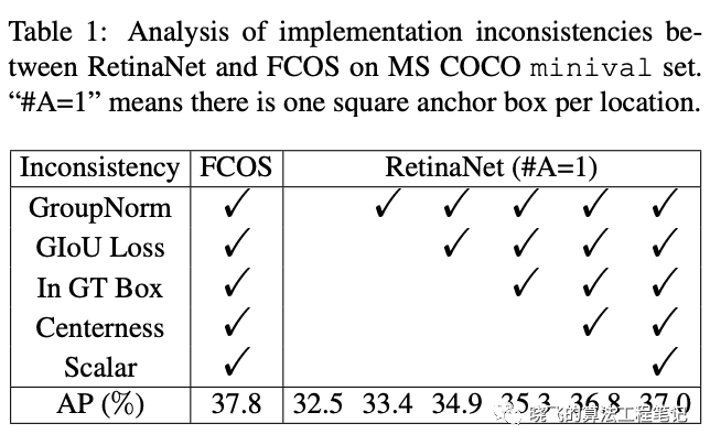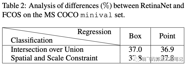 论文选取anchor-based方法RetinaNet和anchor-free方法FCOS进行对比,主要对比正负样本定义和回归开始状态的差异,将RetinaNet的anchor数改为1降低差异性,方便与FCOS比较,后续会测试anchor数带来的作用。