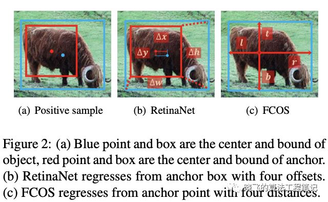 RetinaNet预测4个偏移值对anchor box进行调整输出,而FCOS则预测4个相对于anchor point值对anchor box进行调整输出