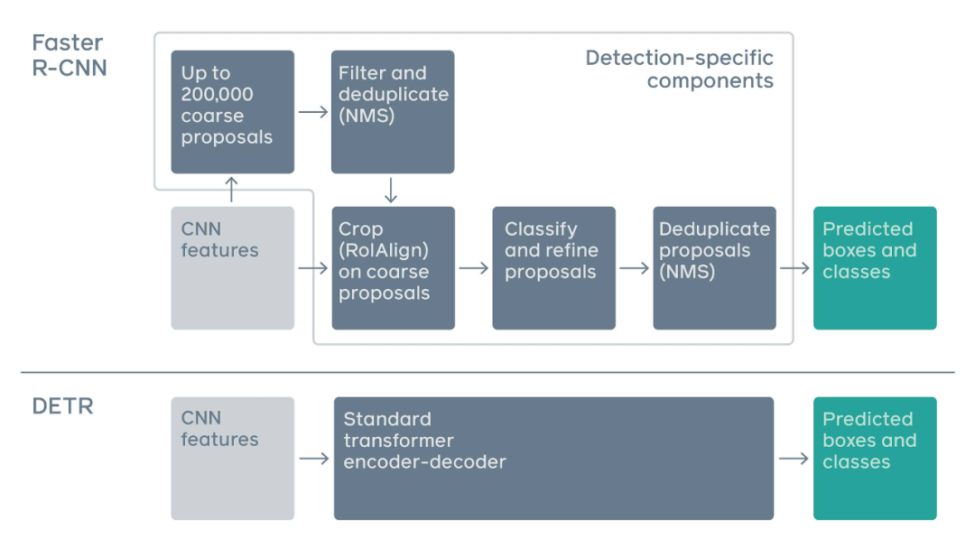 传统两阶段检测系统,如 Faster R-CNN,通过对大量粗糙候选区域的过滤来预测目标边界框。与之相比,DETR 利用标准 Transformer 架构来执行传统上特定于目标检测的操作,从而简化了检测 pipeline。