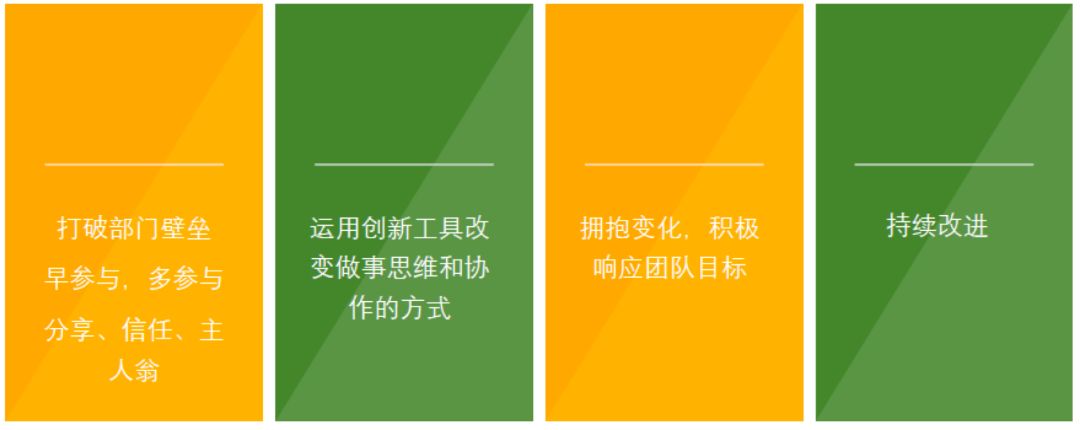 对于冗余的、笨重的、低效率的沟通或者协作都要消除。同时,我们要拥抱变化,积极响应团队的目标;不要觉得测试工具的改变会给自己带来很多的挑战从而感到害怕和没有信心。而是,应该有一颗拥抱变化的心态,积极的参与,并且持续的改进。