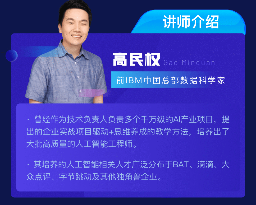 这次训练营的讲师是高民权老师,他从2018年至今,培养过诸多AI算法工程师,如果只算BAT、滴滴、字节跳动、微博、美团点评这些全国一线的企业,他的学生有超过50名就职在这些公司的算法岗位。入职后几乎很少有人跳槽或者被优化的,不少人现在也做到了技术leader这个级别。