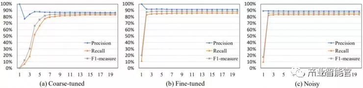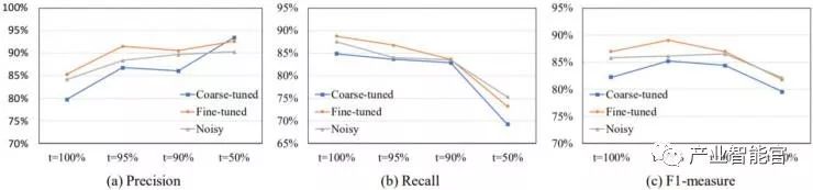 图 3 给出了不同阈值的比较情况。使用更严格的阈值(更小的百分数)会得到更高的精度和相对更低的召回率。我们在本任务中选择的阈值是 95%。