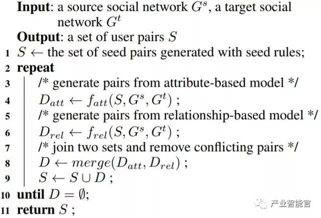 CoLink 框架基于如算法 1 所示的协同训练算法。我们在该框架中定义两个不同的模型:一个基于属性的模型 fatt 和一个基于关系的模型 frel。这两个模型都会进行二元分类预测,将一组给定实体对分类为正例(链接的)或负例(非链接的)。该协同训练算法以迭代的方式不断增强这两个模型。在每一次协同训练迭代过程中,两个模型都会使用已链接配对集 S 进行再训练。然后使用这两个模型生成的高质量的已链接配对会被合并到 S 中以用于下一次迭代,直到 S 收敛。在最开始时,需要一个初始的已链接配对集(简称种子集)来启动这个协同训练过程,这个集合可以通过一组种子规则生成。根据模型所用的算法,基于属性的模型和基于关系的模型的训练可能会需要负例。算法 1 中没有给出采样负例的过程。