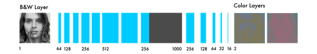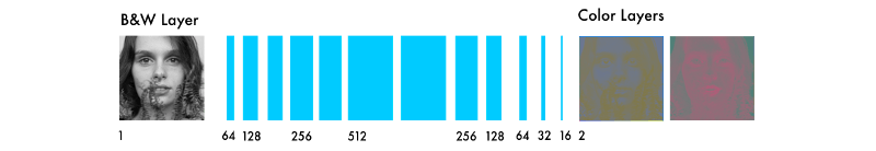 当我们训练网络时,我们使用了彩色图像,并把RGB色彩空间转换成了Lab色彩空间。如下图所示,黑白图层是我们的输入,两个彩色图层是输出。