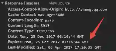 max-age(单位为s)指定设置缓存最大的有效时间,定义的是时间长短。当浏览器向服务器发送请求后,在max-age这段时间里浏览器就不会再向服务器发送请求了。我们来找个资源看下。比如QQ推广上的css资源,max-age=3600,也就是说缓存有效期为3600秒(也就是1h)。于是在1天内都会使用这个版本的资源,即使服务器上的资源发生了变化,浏览器也不会得到通知。max-age会覆盖掉Expires,后面会有讨论