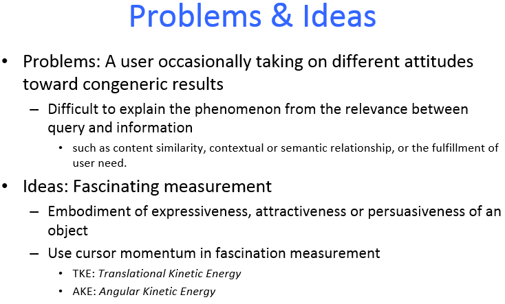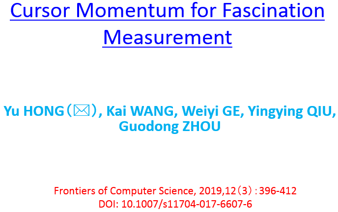 在大多数情况下,滑鼠由手直接驱动,通过鼠标(或触摸板)而移动,我们使用滑鼠移动作为关键特征来分析用户对搜索结果的关注度。本文深入研究在非常短的时间内发生的目标导向滑鼠移动,这种移动通常发生在用户点击与决策行为之间。首先,简要介绍关注度检测方法,包括目前的相关工作,相关背景知识及本文动机;然后,介绍了滑鼠动量的方法,并用不同的检索关注度排序方法进行实验。最后,通过对样本的分析讨论本文所提方法的利与弊。