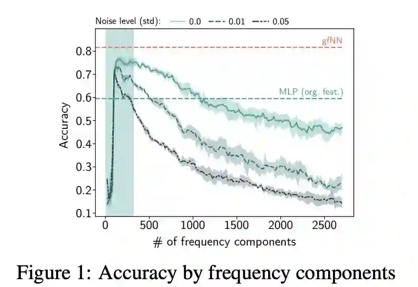 本研究的第一个贡献是验证了常用数据集的假设1(第3节)。图1显示了针对不同频率成分(frequency components)的特征训练的2层感知器(MLPs)的性能。在所有基准数据集中,我们看到只有少数频率成分有助于学习。在特征向量中加入更多的频率成分只会导致性能下降。反过来,当我们将高斯噪声N (0, σ2 ) 添加到特征中时,分类精度变得更糟了。