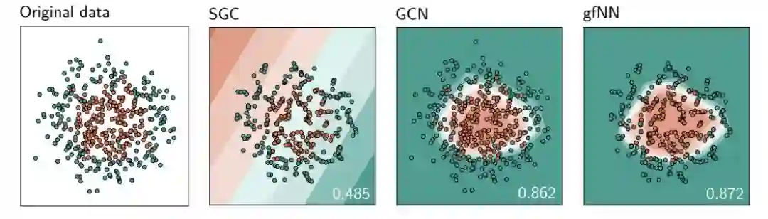 最后,我们将gfNN与SGC模型进行了比较。虽然SGC在基准数据集上计算速度快、精度高,但我们的分析表明,当特征输入是非线性可分的时,SGC会失败,因为图卷积部分对非线性流形学习没有贡献。为了实证证明这个观点,我们创建了一个人工数据集。