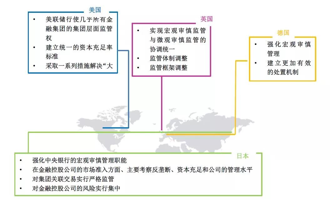 • 制定独立的金控集团监管法律法规 • 采取金控集团准入资质监管 • 确定金控集团监管部门并实施宏观审慎监管 |
