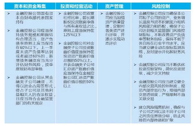 • 降低金控集团成员企业金融业务之间的风险相关性,避免风险传染 • 限制金控集团开展非金融业务投资 • 采用充分的风险管理流程对大额风险暴露进行控制和计量,并实现风险信息在各金融监管部门之间共享 |