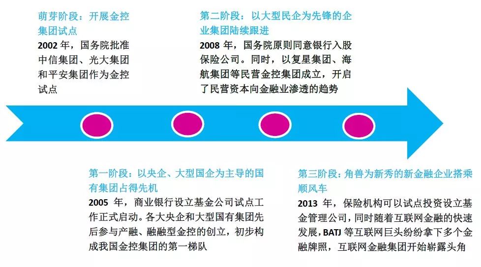 2002年国务院批准中信、光大、平安为3家金控集团综合试点,作为我国开展金融业综合经营试点工作的市场主体。随着近十多年金融市场实践与发展,目前我国已经初步形成四大类的金控集团模式: