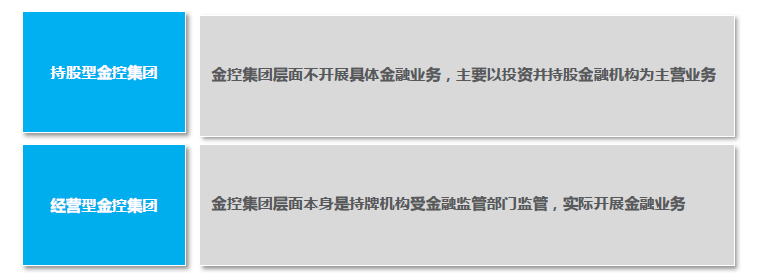 存在一个控股公司作为集团母体。该母体既可以是一个单纯的投资机构,也可以是以一项金融业务为载体的经营机构,前者为纯粹型金融控股公司,后者为事业型金融控股公司