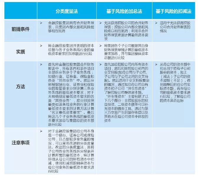 • 评估金控集团层面资本充足状况 • 识别金融集团内部对资本金的重复计算 • 防止过高杠杆率以及金控集团内部的关联交易和资本套利 • 覆盖金控集团内不受监管的实体成员 |