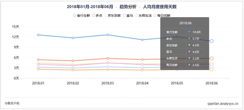 从用户粘性方面看,食行生鲜次月留存率2018年1月—6月一直维持在50%以上,人均月度使用天数1月—6月一直维持在10天左右,这说明食行生鲜用户复购率很高,并在购买上呈现出高频的特点。