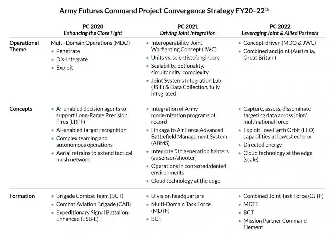 陆军现代化战略描述了陆军将如何作战,用什么作战以及如何组织起来支持联合部队。陆军致力于发展作战网络、技术和概念,通过一系列名为 "项目融合"(PC)的演示和实验来实现超额匹配并为联合部队提供信息。这是一场持续的学习运动,旨在迅速 "融合"所有领域(陆地、空中、海上、太空和网络空间)的效果,并塑造陆军的新兴理论、组织、训练、能力、研究和发展以及后勤。