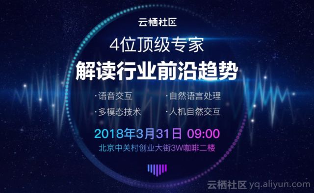 云栖社区将于2018年3月31日在北京中关村创业大街3W咖啡举办一场《未来人机交互技术沙龙》,届时将有4位行业顶级专家对人机交互技术进行详细的解读。
