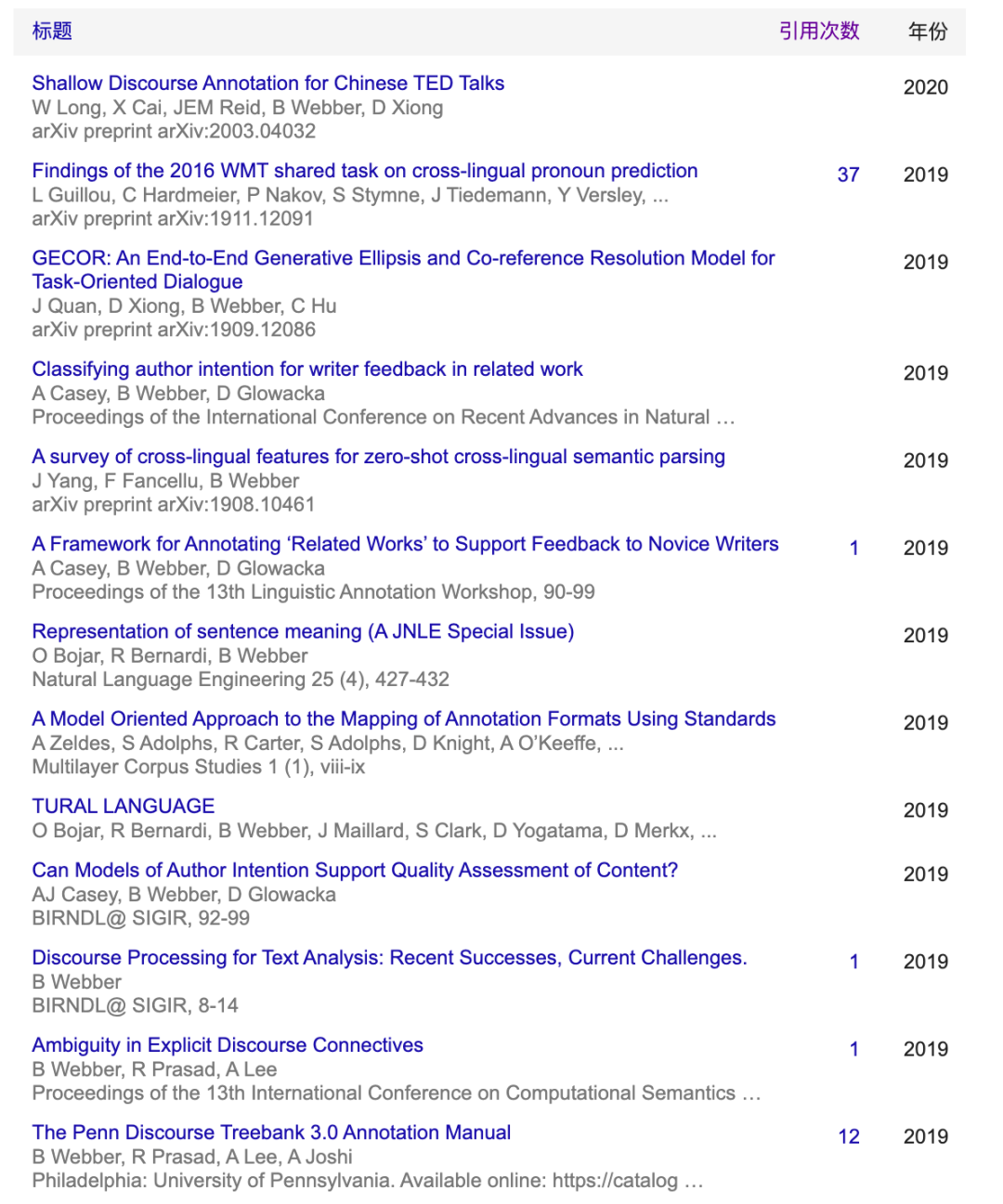 出生于 1946 年,现年 74 岁的 Bonnie Webber 仍然笔耕不辍。从她的谷歌学术页面,我们可以看到她 2019 年参与的论文数量达 12 篇之多。