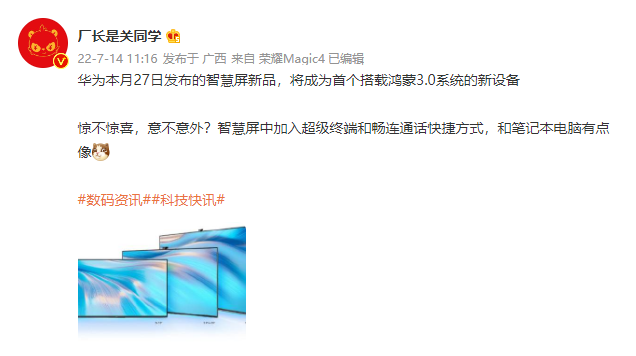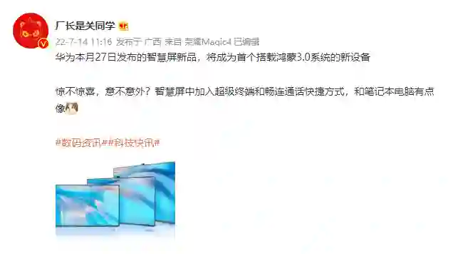 据 @厂长是关同学爆料,华为将在本月 27 号发布大量新品,其中有一个智慧屏新品将首发搭载鸿蒙 3.0 系统。华为近日有多款新机通过了国家 3C 质量认证,其中还包括新品液晶电视 TV。本月 27 号将发布的新品包括:Free buds Pro 2 耳机、智慧屏 S Pro 86、新款 Mate book X Pro、旗舰平板 MatePad Pro 11 和华为畅享 50 Pro。