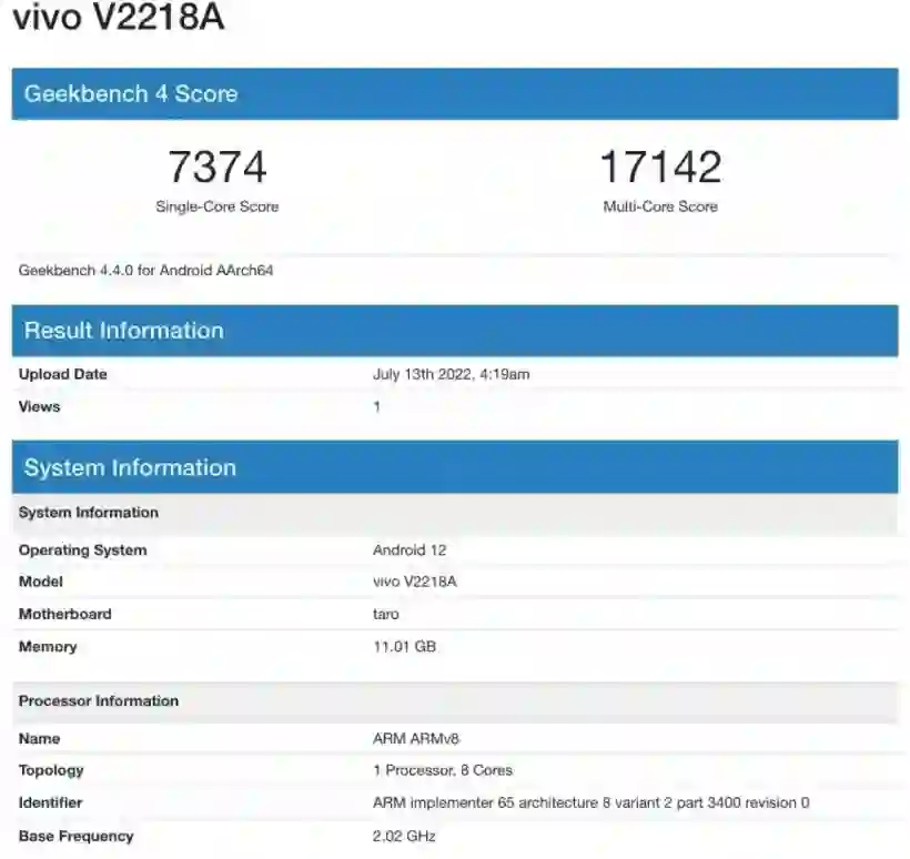 今日,一款型号为 vivo V2218A 的手机出现在 Geekbench 跑分网站上,这款手机的主板信息显示了“taro”,这是高通最新平台的代号,即骁龙 8+ Gen 1 芯片,拥有 3.19 GHz 峰值 CPU 频率。另外该机内置 12G 内存,运行 Android 12 系统,预计这款新机是即将发布的 iQOO 10 Pro。在 Geekbench 4.4 版本上,iQOO 10 Pro 手机的单核性能得分达到 7374,多核得分达到 17142。iQOO 10 系列手机此前宣布将于 7 月 19 日发布。