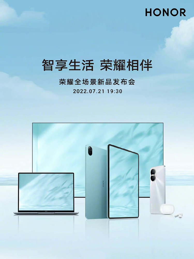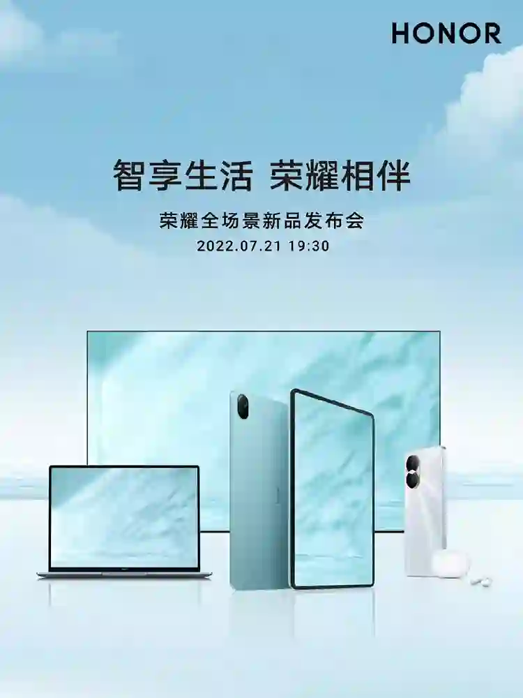 今日,荣耀官方正式官宣,将在 7 月 21 日晚 19 时 30 分举办全场景新品发布会,届时将推出旗下多款全场景新品。据了解,此次发布会的全场景新品包括有荣耀平板 8、荣耀 X40i 手机,新款的 MagicBook 和荣耀智慧屏以及新款 FlyPods 耳机。目前荣耀平板 8 已有不少规格信息曝光出来,平板搭载的是骁龙 680 处理器,屏幕 12 英寸大小,分辨率为 2K,支持 22.5W 有线充电,应该是一款定价低于 2000 元的性价比平板产品。