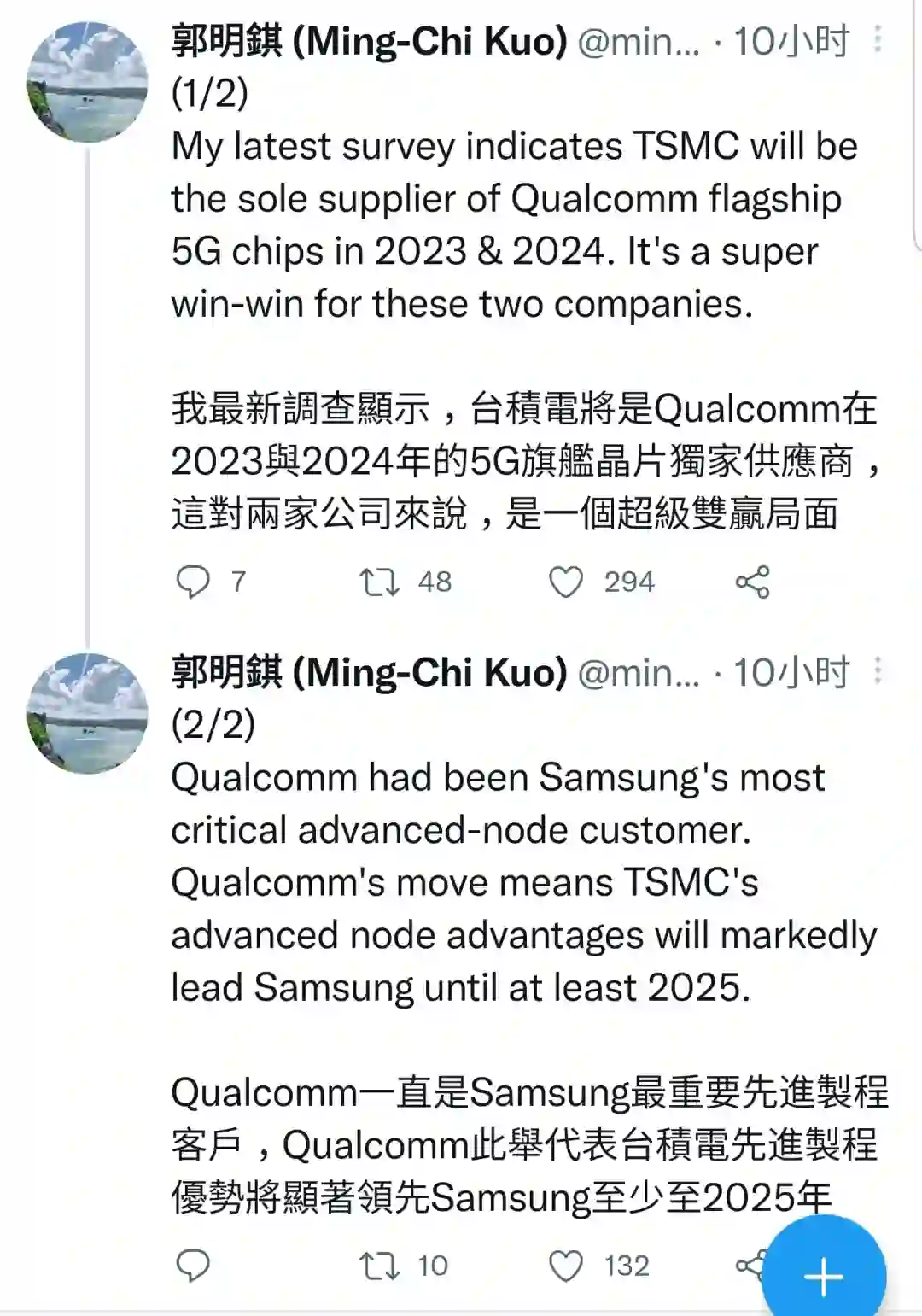 知名分析师郭明錤发文称,他的最新调查显示,台积电将是高通在 2023 年和 2024 年 5G 旗舰芯片的独家供应商。郭明錤还补充道,“高通一直是三星最重要先进制程客户,高通此举代表台积电先进制程优势将显著领先三星至少至 2025 年。”除此之外,今年 6 月,郭明錤表示,高通将推出代号为 Hamoa 的芯片与苹果 Apple Silicon 芯片全力竞争。对比苹果 M2 采用台积电 5nm N5P 工艺,高通 Hamoa 芯片采用 4nm 工艺,预计 2023 年第三季度量产。