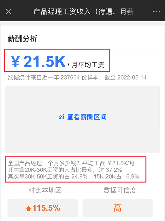 截止2022年-05-14,产品经理平均月工资 21.5K,其中15-20K占16.9%,20K-30K的占37.2%,30K-50K占24.8%。
