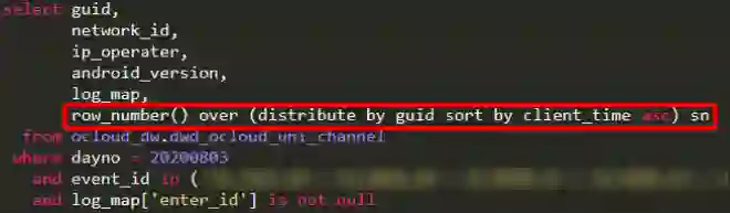 这应该是网上讲得比较多的情形,我也简略说下。在优化某任务的时候,我们发现运行时间一直在增长,一度达到 7 个小时,直到 8 月 1 号便再也跑不成功,总是 OOM(内存不够),即使将 executor 的内存调高到 10G 依然解决不了问题。经过仔细诊断,发现任务慢在一个开窗函数阶段,代码如下:
