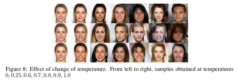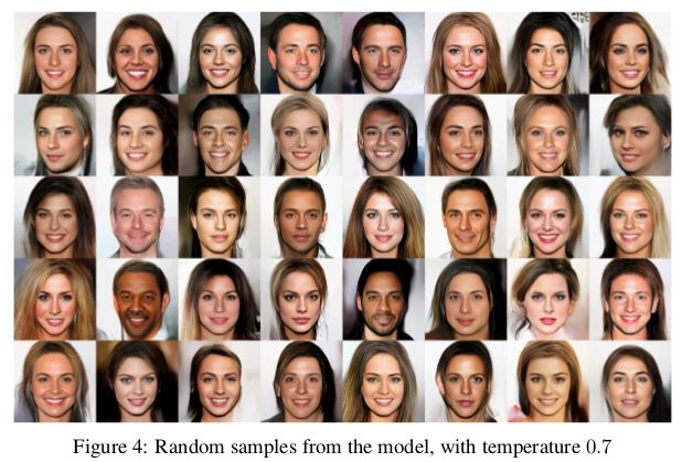 在高分辨率图像的生成上,Glow 使用了 CelebA-HQ 数据集,数据集包含 3 万张高分辨率的图片。实验生成 256 x 256 图像,设置 K=32,L=6。我们看到这里的 L 取了 6,在高分辨率下,多尺度的丰富可能会让得到的潜在变量具有更多的图像细节。试验中采用了退火算法来优化实验,在退火参数 T=0.7 时候,合成的随机样本如下图: