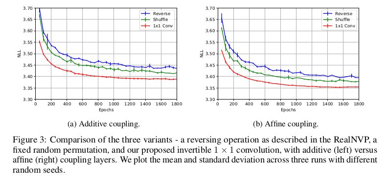 实验的开篇是比较 Glow 和 RealNVP,反转操作上 NICE 采用反转,RealNVP 采用固定随机排列,Glow 采用可逆 1 × 1 卷积,并且耦合方式也影响实验的效果,文章比较了加性耦合层和仿射耦合层的性能差距。通过在 CIFAR-10 数据集的平均负对数似然(每维度的比特)来衡量不同操作的差距,其中所有模型都经过 K = 32 和 L = 3 的训练,实验效果如下图: