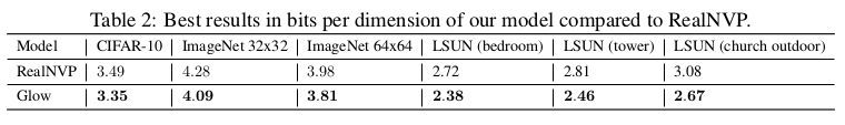 为了验证 RealNVP 和 Glow 整体的框架下的差距,实验进一步扩展,比较了 CIFAR-10,ImageNet 和 LSUN 数据集上两者的差距,在相同预处理下得到的结果如下:
