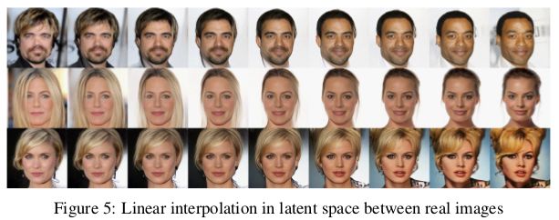 3. 对下游任务有用的潜在空间,自回归模型的隐藏层有未知的边际分布,使其执行有效的数据操作上很困难;在 GAN 中,由于模型没有编码器使得数据点通常不能在潜在空间中直接被表征,并且表征完整的数据分布也是不容易的。而在可逆生成模型和 VAE 中不会如此,它们允许多种应用,例如数据点之间的插值,和已有数据点的有目的修改。