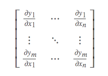 。 这些函数的偏导数(如果存在)可以组成一个 m 行 n 列的矩阵,这就是所谓的雅可比矩阵: