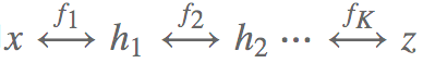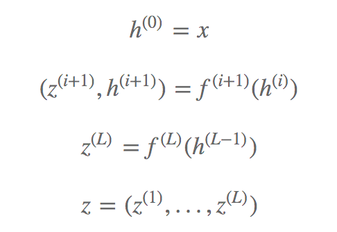 上图的意思就是每一次做流生成潜在变量时,由于要将两个潜在变量拼接后输出,为了保证多尺度就每次保留一个潜在变量,将另一个潜在变量返回到输入再次进行流操作, 经过 L−1 次流操作后将不再返回到输入而是直接输出和之前的 L−1 个潜在变量拼接形成最后的潜在变量的输出。我们再结合公式理解一下,这里稍微有点绕:
