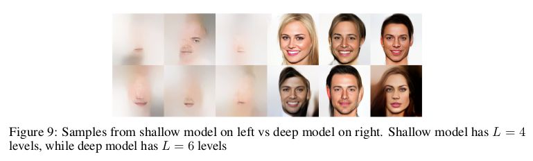 RealNVP 在 NICE 的基础上的另一大改进就是做多尺度框架的设计。所谓的多尺度就是映射得到的最终潜在空间不是一次得到的,而是通过不同尺度的 潜在变量拼接而成的。我们看一下 RealNVP 给出的多样性示例解释图,这个图其实还不太清晰,在 Glow 中给的图就已经很清晰了。