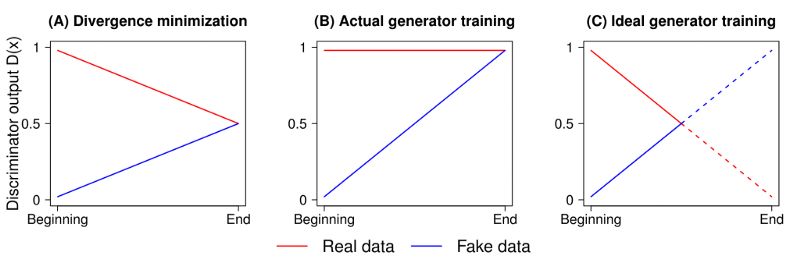 使用标准 GAN loss 时鉴别器的输出 (图 B)。图 C 表示输出曲线的实际样子。图 A 表示 JS 散度的最优解。