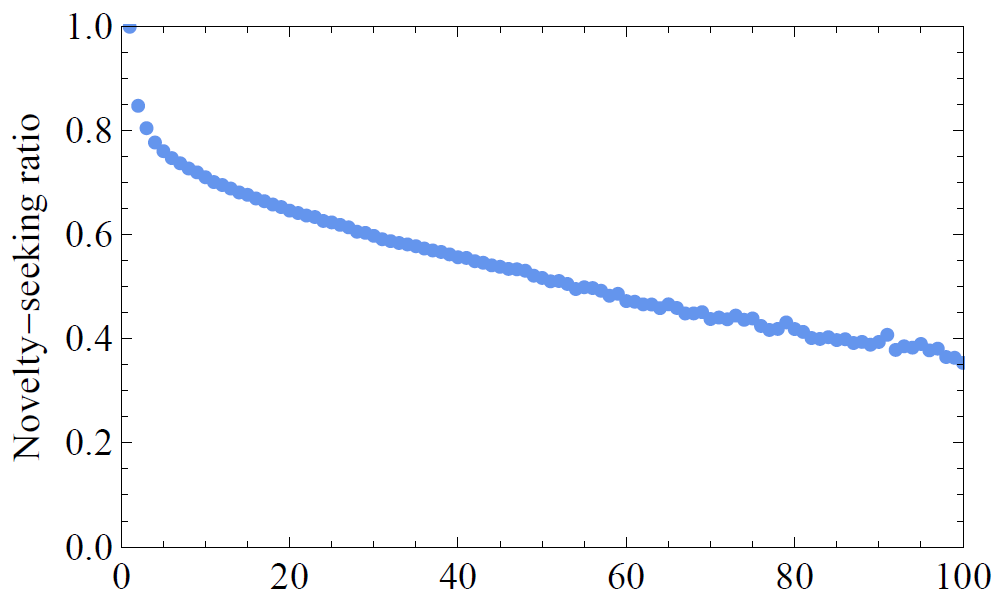 图3 该图统计了用户就餐次数和去新餐馆的概率,可以看到,即使一个用户在100次就餐之后,有接近40%的概率去一个新的餐馆就餐