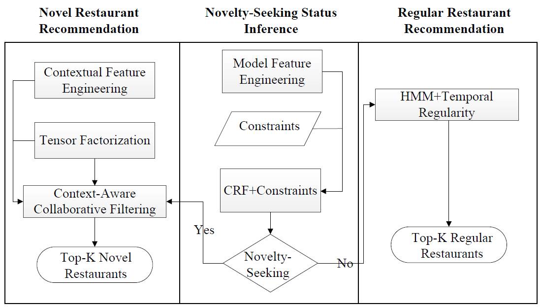 因此,为了区分是推荐去过的餐馆还是推荐新餐馆,我们从用户的历史就餐行为中学习用户对新餐馆的偏好,而这正是用户性格中的猎奇特性。在下一次餐馆推荐时,首先预测用户是否会选择新餐馆,针对新餐馆和去过的餐馆分别设计不同的推荐算法。如下图所示,若预测用户会去新餐馆时,使用基于环境信息的张量分解算法进行推荐;若预测用户可能会去之前去过的餐馆,则使用隐马尔科夫模型进行推荐。我们使用大众点评中的餐馆签到数据进行了实验,发现猎奇推荐算法明显好于协同过滤等基准算法。